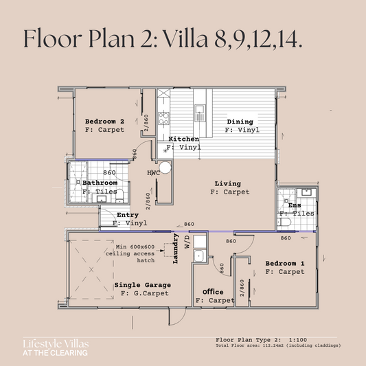 All villas have a single garage (with garage door opener), two double bedrooms, a home office/hobby room, a main bathroom and second ensuite, open plan living/dining/kitchen and private